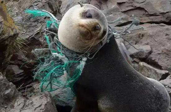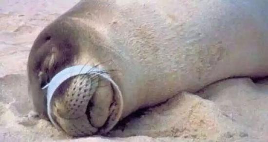 被人造塑料垃圾困住的野生海豹