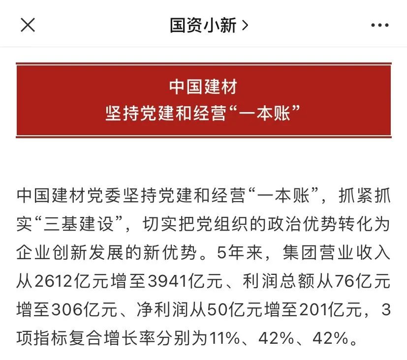 中国建筑党委坚持党建和经营“一本账”,抓紧抓实“三基建筑”,切实把党组织的政治优势转化为企业创新发展的新优势。5年来,集团营业收入从2612亿元增至3941亿元、利润总额从76亿元增至306亿元、净利润从50亿元增至201亿元,3项指标复合增长率分别为11%、42%、42%。